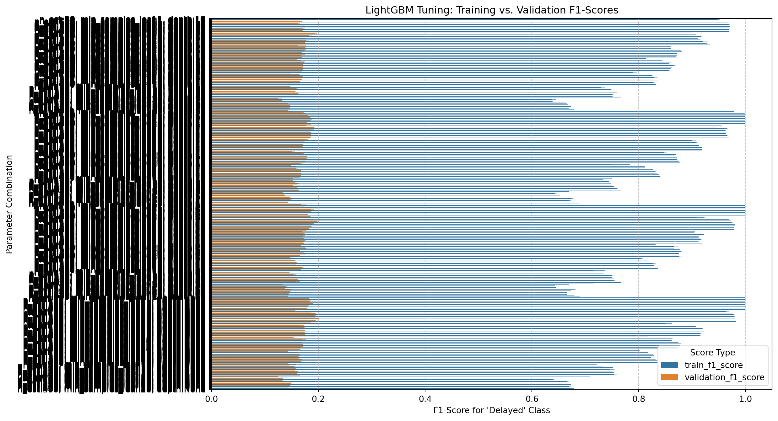 plt.title('LightGBM Tuning: Training vs. Validation F1-Scores')