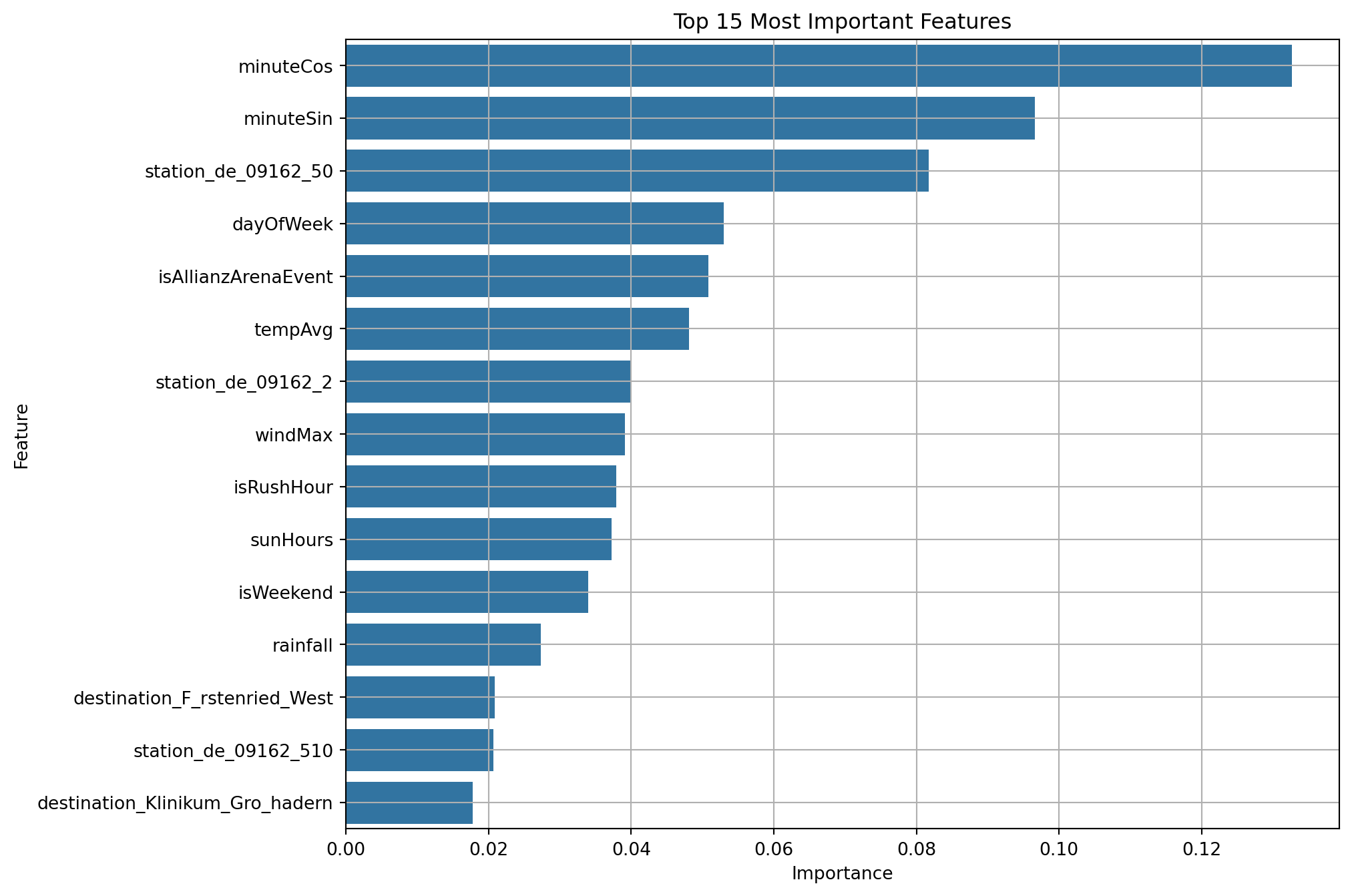 mvg_data.sample(5)| station | plannedDepartureTime | realtime | delayInMinutes | label | destination | onTime | plannedDepartureTime_dt | minuteOfDay | minuteSin | ... | isMajorEvent | isHoliday | isAllianzArenaEvent | tempMin | tempMax | tempAvg | rainfall | sunHours | windMax | snowfall | |